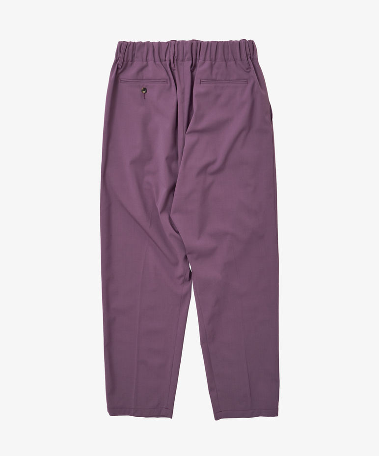 スーパーワイドなウエストを2タックとウエストゴムやドローコードでイージーパンツ仕様にし、裾にかけてテーパードさせたパンツ。