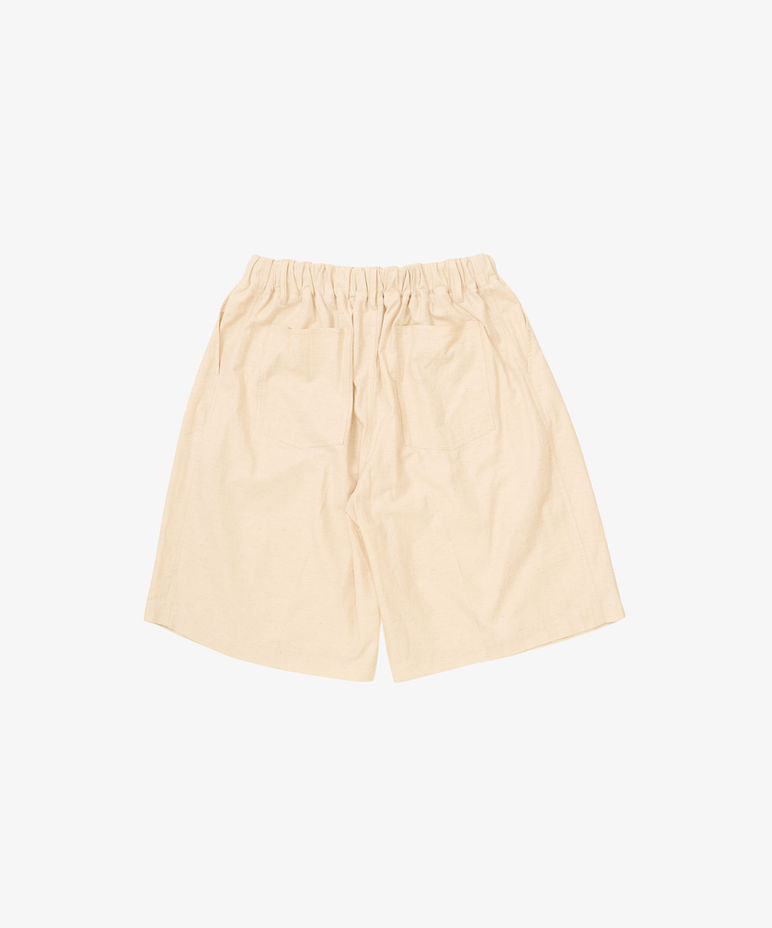 Our Circular Fatigue Short Pants are crafted from a breathable and lightweight cotton-linen back satin, this fabric features a soft, linen-like texture with a beautifully supple drape. Irregular slubs throughout the weave create a naturally textured surface, giving it depth and character.