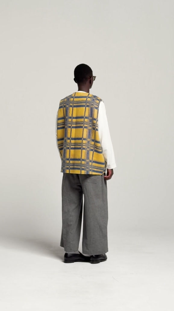 Our Gilet is wide and boxy, featuring shell buttons on the center and sides, a collarless neckline, two large flap pockets, and hidden side pockets. Its design ensures that you can carry all of your belongings without compromising comfort.