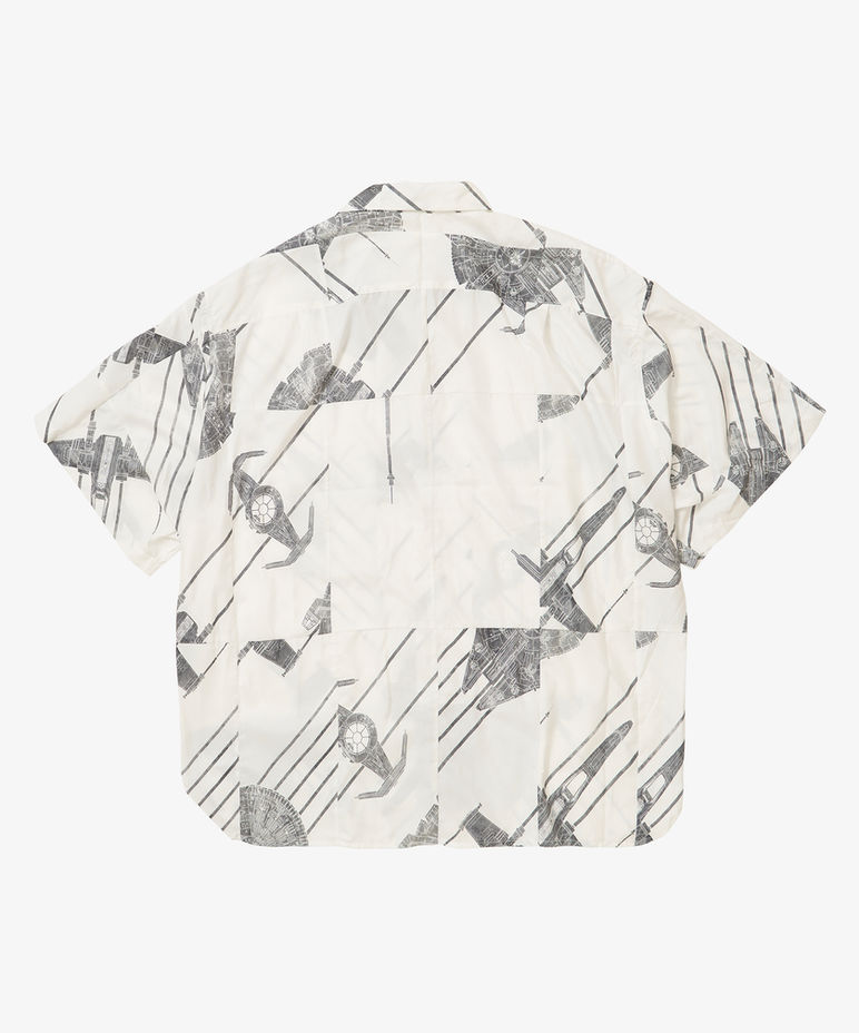 After carefully selecting and sorting vintage bedsheets sourced from the US, we applied our Artisanal Collection process: deconstructing the fabric, cutting it into squares, and reconstructing them through our signature patchwork technique. The outcome is a limited series of open-collar shirts, each featuring a left chest pocket, a wide boxy cropped bodice, voluminous short sleeves, and unique hand-numbering along the collar and interior.