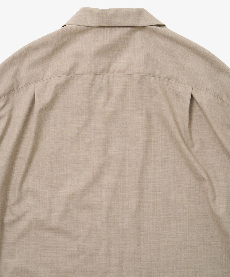 Following Sillage body aesthetic the shirt features 1 patch pockets, an open collar, and shell buttons. The shirt can be worn as a shirt or a light jacket. Here in its most versatile version in Tropical Wool, which is a super fine gauge, summer worsted wool, it is suitable for any type of climate.