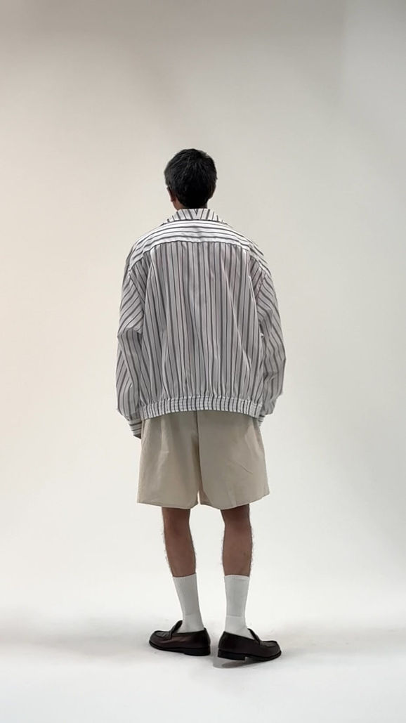 スタイルはUKのウィメンズのビンテージブルゾンからインスピレーションを受けた新型のショート丈のブルゾンです。胸元を綺麗に見せる襟のデザイン。両サイドの上部に1箇所つくボタンがエレガントです。裾はリブになっていて丸みを帯びた美しいシルエットが出ます。いつも通りのSillageが提案するオーバーサイズシルエット。